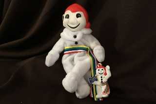 Souvenir Bonhomme doll from the 2001 Quebec Winter Carnival. It has a tag on its left arm featuring its image with the words "Carnaval de Québec 26 janvier au 11 février 2001" on the back. It is in very good condition despite his age except for some small stains on the right mitten, the back of its costume, and on its head (small red dot). It measures 21 cm tall. Made in China.